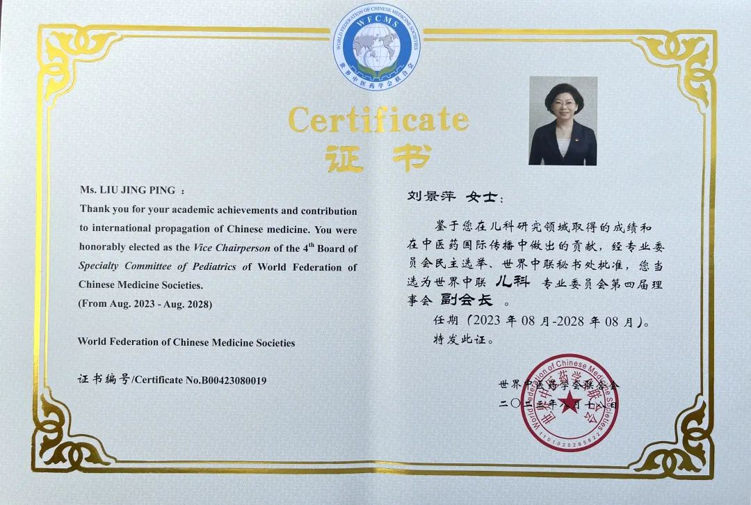 一竞技药业集团党委书记、董事长刘景萍当选世界中医药学会联合会儿科专业委员会第四届理事会副会长
